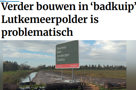 Wij zijn er dit jaar in samenwerking met onze fractie in stadsdeel Amsterdam Nieuw-West opnieuw voor opgekomen om de bebouwing van de Lutkemeer tegen te gaan. Om Amsterdam optimaal te faciliteren in een verstandige keuze, hebben wij een debat aangevraagd, waarin wij ervoor pleitten informatie met Amsterdam te delen over hoe de Lutkemeer, als een badkuip van meer dan 5 meter diep, volloopt bij hevige regenval (de blauwe vlek op het plaatje). Hier is over gepubliceerd in lokale media: